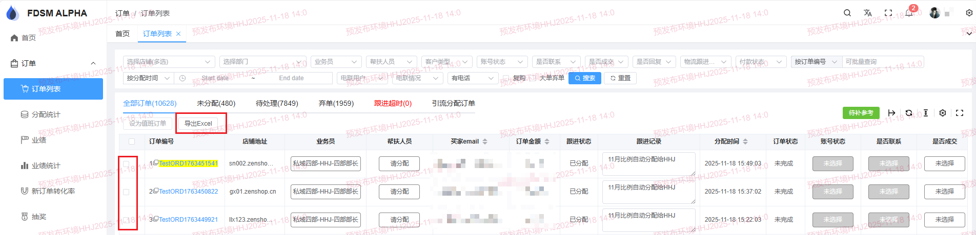 •直接点击【导出Excel】按钮,导出列表全部数据; •选择订单数据,点击【导出Excel】按钮,导出选中的订单数据。