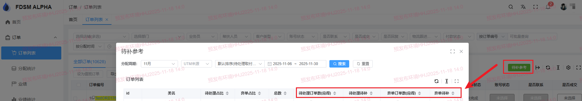 •点击【待补参考】按钮,可以查看弃单/待处理订单的应得和待补数据; •数据和【分配统计】页面数据一致,不统计值班和轮询订单数据。