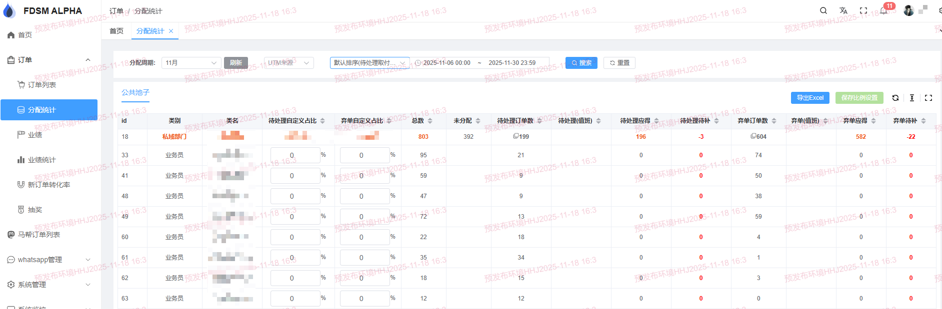 •新客户订单,系统按比例自动分配给部门部长,再由部长/组长/经理组手动分配给组员,此页面显示系统分配的订单数量,不统计轮询订单、值班订单和老客户订单; •部门的分配占比数据由系统管理员设置,系统按比例自动分配订单; •业务员的分配占比由部长/组长设置,仅供参考,不参与自动分配。