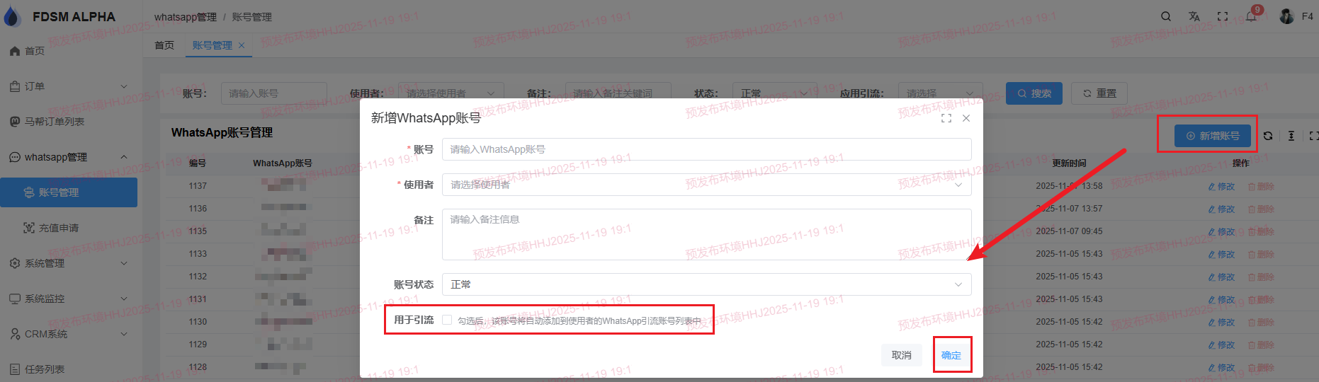 •右侧点击【新增账号】按钮,填写信息,点击【确定】,成功添加账号; •勾选【用于引流】后,将自动添加到使用者的引流账号列表中。