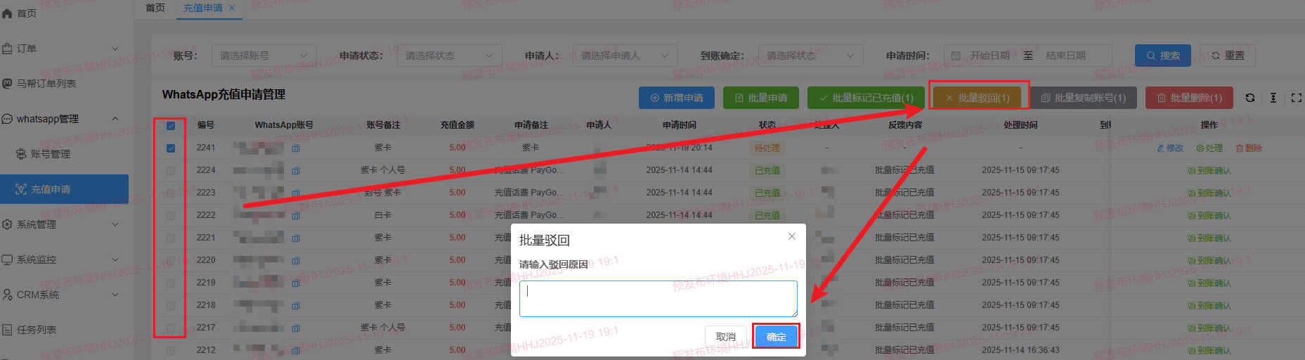 •选择数据,点击【批量驳回】按钮,输入驳回原因,点击【确定】,驳回成功。