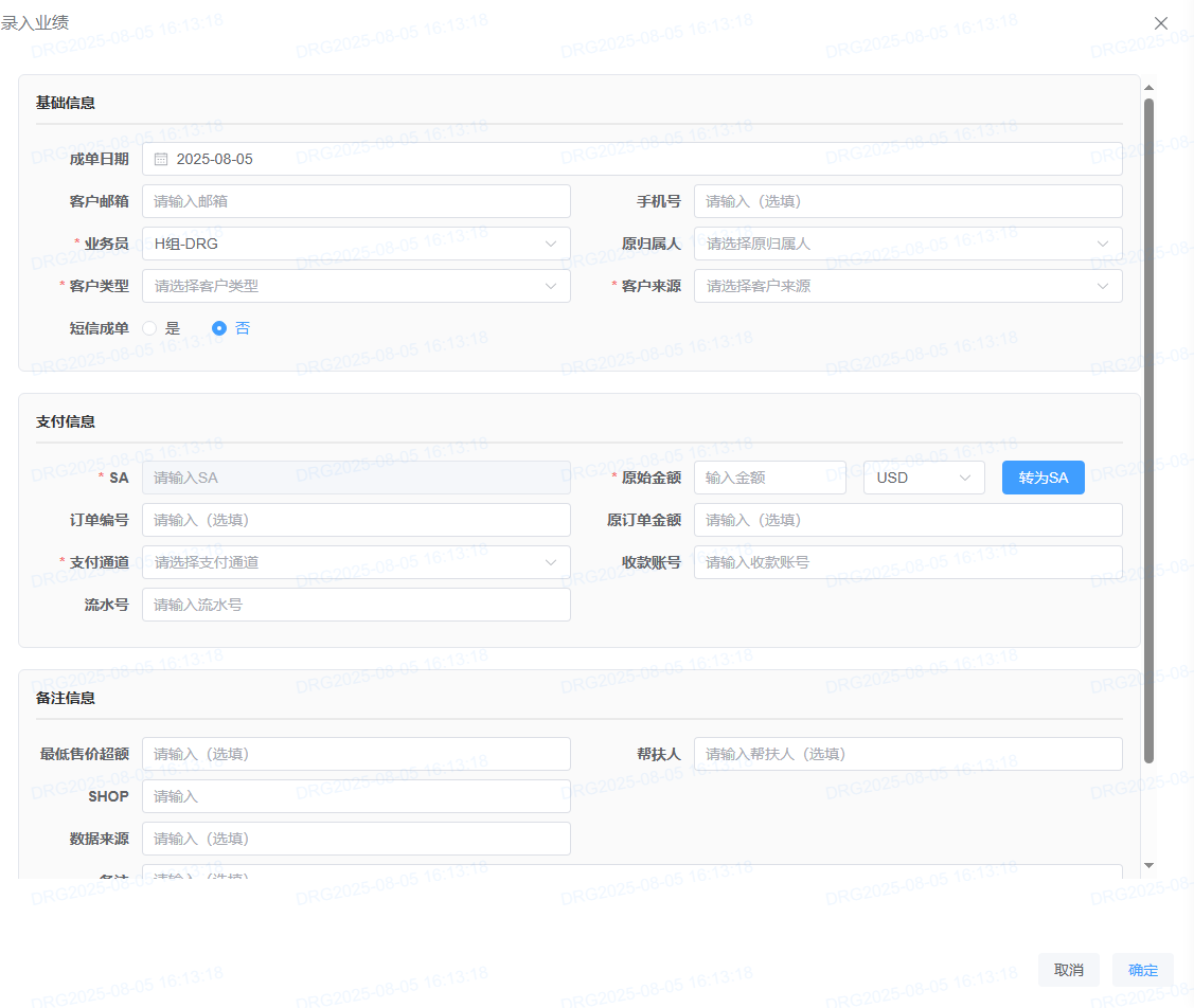 <span style="font-family:楷体">**用户点击订单下方“业绩”按钮进入业绩界面。**</span> <span style="font-family:楷体"> </span> <span style="font-family:楷体">**用户点击“录入业绩”按钮进入录入业绩界面。**</span> <span style="font-family:楷体"> </span> <span style="font-family:楷体">**1.选择业务员。**</span> <span style="font-family:楷体">**2.选择客户来源。**</span> <span style="font-family:楷体">**3.输入原始金额点击转为SA**</span> <span style="font-family:楷体">**4.选择支付通道**</span> <span style="font-family:楷体">**5.点击确定**</span>