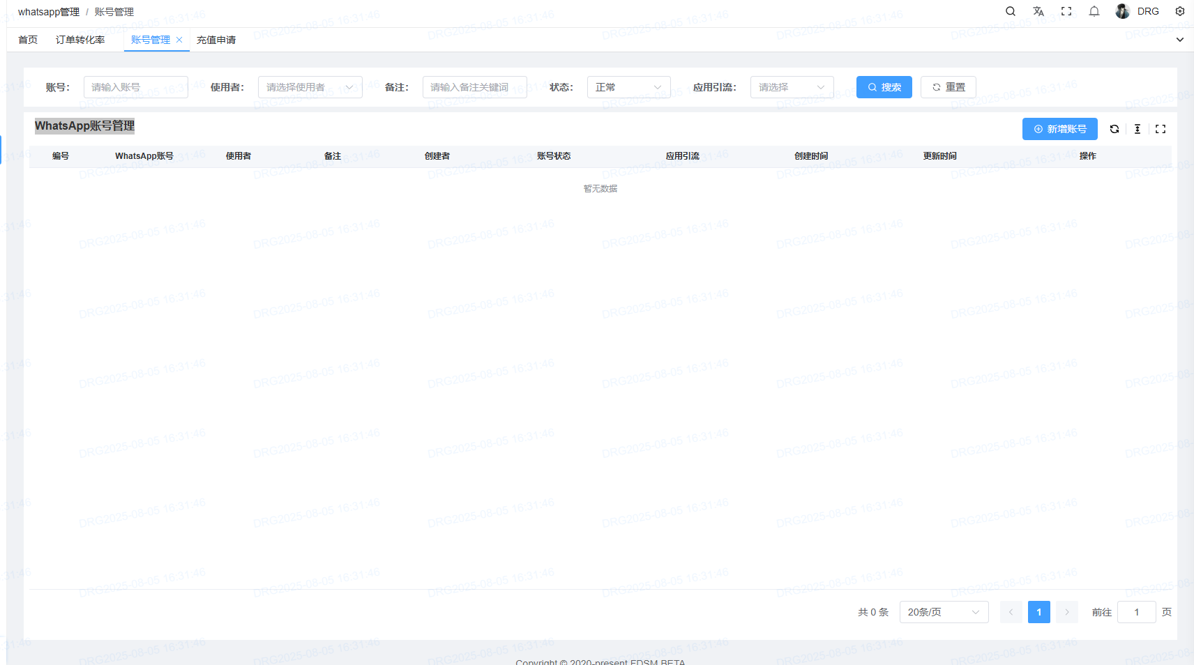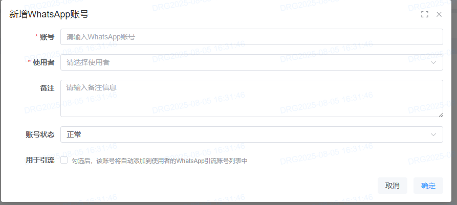 <span style="font-family:楷体">**用户点击whatsapp管理下方的“账号管理”按钮进入WhatsApp账号管理界面。**</span> <span style="font-family:楷体">**账号仅可关联1名使用者。**</span> <span style="font-family:楷体"> </span> <span style="font-family:楷体">**点击“新增账号”按钮进入新增whatsAPP账号界面。**</span> <span style="font-family:楷体"> </span> <span style="font-family:楷体">**1.选择账号**</span> <span style="font-family:楷体">**2.选择使用者**</span> <span style="font-family:楷体">**用于引流说明:选择勾选后,该账号将自动添加到使用者的WhatsApp引流账号列表中。引流账号:独立站产生订单时会自动分配一个whatsapp账号为客户的跟进业务员。订单系统收到独立站订单时,将通过whatsapp账号来匹配系统内的业务员。**</span>