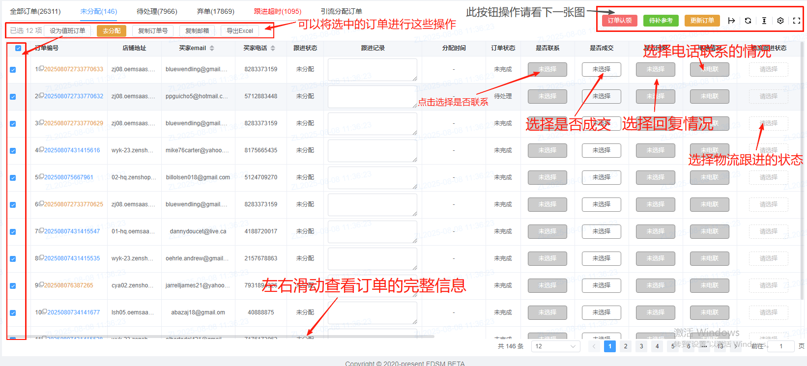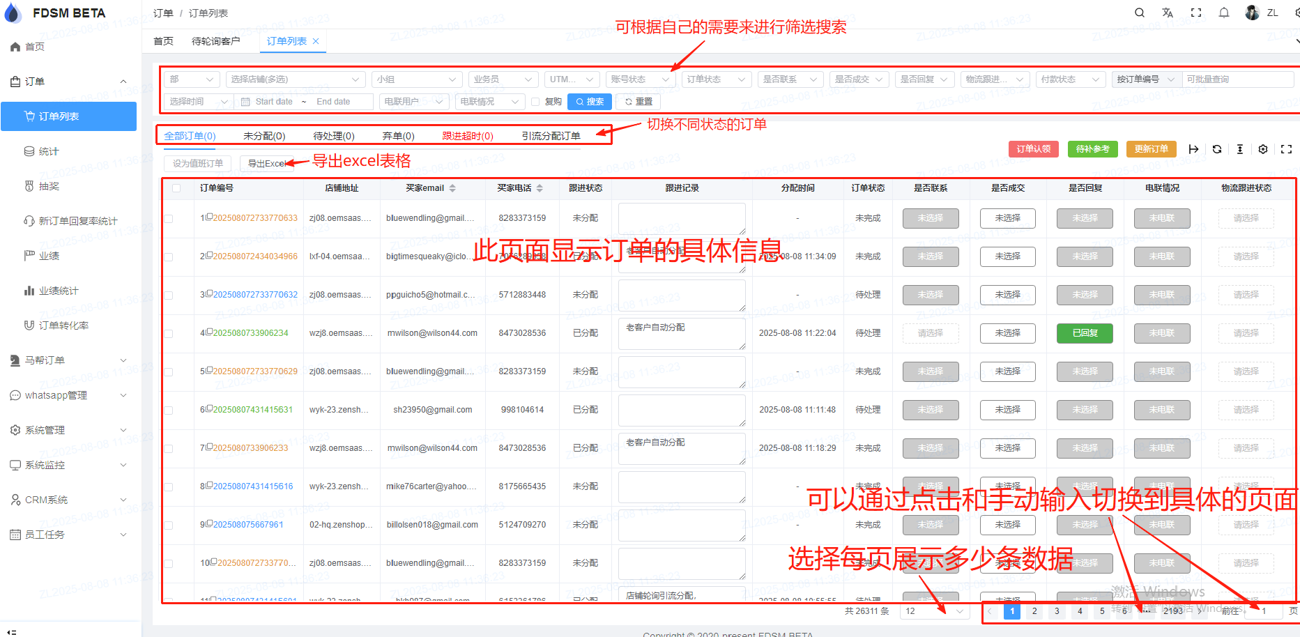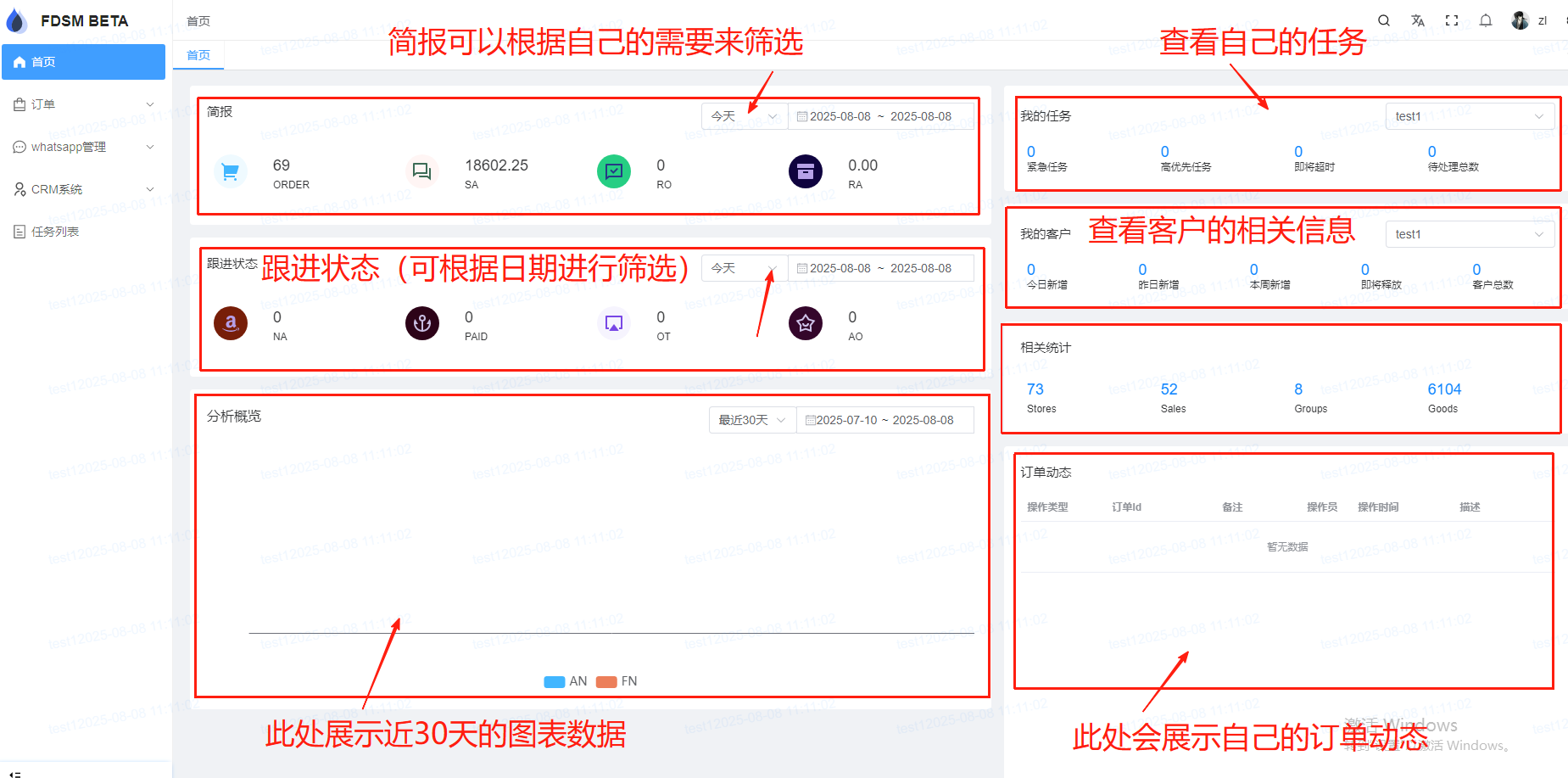 ## 一、概述 FDSM BETA客户订单系统是一个全流程数字化管理平台,同时为用户提供订单处理、库存联动和数据分析功能,通过Web端覆盖,结合权限管理和IP设置规则,实现高效透明的客户管理机制,提升用户体验,增加公司业务的保密性。系统主要分为以下几大模块,订单模块、马帮顶订单模块、WhatsApp管理模块、CRM系统模块以及任务列表模块。 ## 二、系统地址 > assign.cfd ### 三、具体操作流程 ### 3.1 登录 用户通过网址进入系统的登录页面,根据组长提供的账号,输入账号——密码——验证码——点击登录即可进入系统首页。  ### 3.2 首页 登录成功后即可进入系统首页,首页可以查看到简报,跟进状态,分析概览、我的任务相关统计和订单动态我的任务中选择用户可以看到紧急/高优先/即将超时/待处理总数点击可以跳转任务列表。相关统计可以看见相关的销售情况。订单动态可以看到独立站订单分配动态。  ### 3.3订单 #### 3.3.1订单列表(待补参考需补) 点击订单——订单列表就进入了订单列表界面,在此界面中我们可以看到自己账号下的订单以及订单的详细信息,可以根据自己的需要在筛选框中筛选想要的内容,切换不同状态的订单,切换订单的实时情况(如是否联系、是否成交、客户是否回复消息、电话联系是否接听以及一系列的情况),根据自己跟客户的聊天情况来认领订单(只需上传截图即可),查看待补参考和刷新页面以及设置订单的展示信息等等;还可以设置页面展示的数据量的多少,拖动滚动条来查看订单的所有信息以及点击或者手动输入页码来查看对应页面的信息;根据复选框来选中对应的订单来设置值班订单,复制订单号和邮箱,导出为一个excel的表格。     #### 3.3.2统计 #### 3.3.3抽奖 #### 3.3.4新订单回复率统计 #### 3.3.5业绩 #### 3.3.6业绩统计 #### 3.3.7订单转化率 ### 3.4 whatsapp管理 #### 3.4.1账号管理 #### 3.4.2充值申请 ### 3.5 CRM系统 #### 3.5.1客户管理 #### 3.5.2Top数据 #### 3.5.3待轮询客户 #### 3.5.4回访审核 ### 3.6任务列表