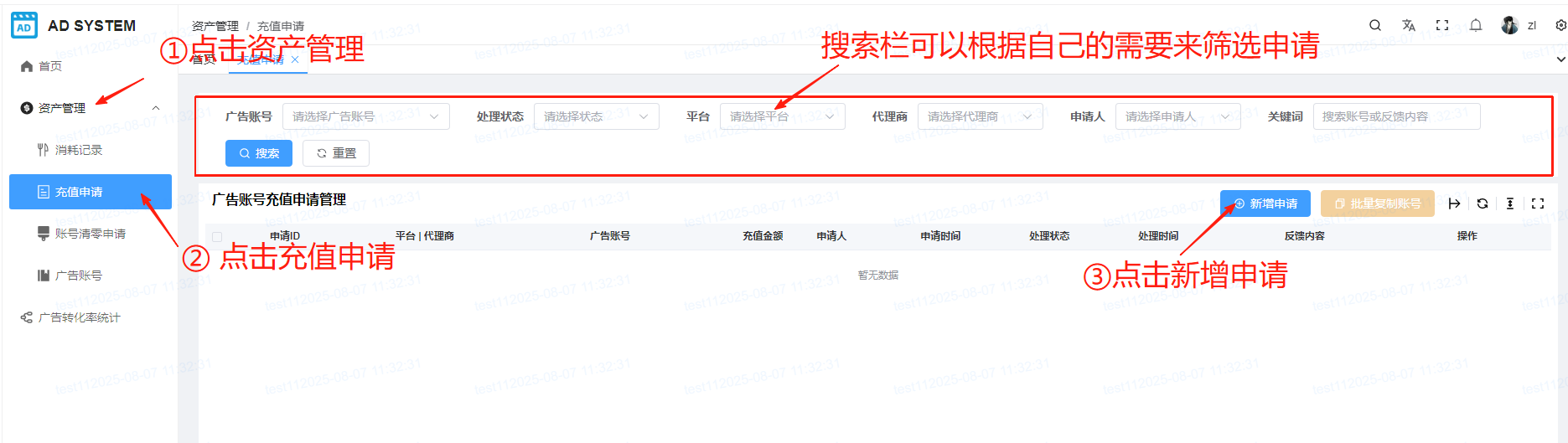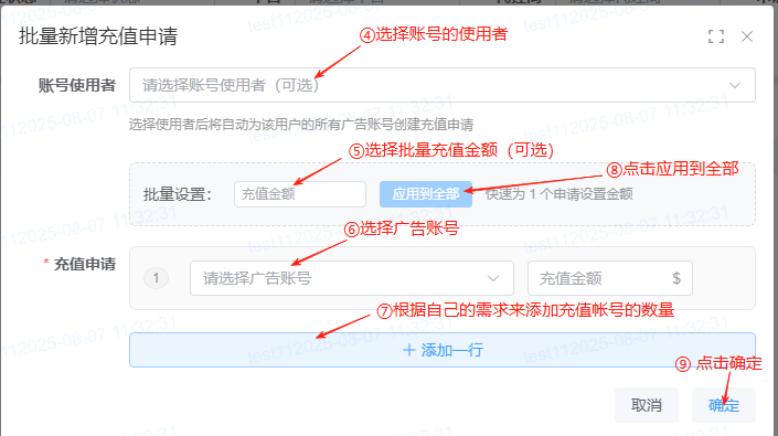 点击首页的资产管理下的充值申请、再点击新增申请,选择账号的使用者(可选),广告账号和充值金额,点击确定即可申请成功。 账号下有多个广告账号也可以使用批量充值的功能,选择账号的使用者后,在批量设置中输入金额(可选,若每个账号充值金额不一,则需手动填写对应的金额,金额限制0.01-999999999.99),然后点击添加一行按钮(根据自己需要充值账号的数量来添加),选择对应的广告账号之后,点击应用到全部,点击确定即可申请成功。 申请成功后需等管理员充值后申请状态(通过,驳回)才会改变(若找不到账号则需要在广告账号中添加对应的账号,在返回充值申请页面对该账号进行申请)。
