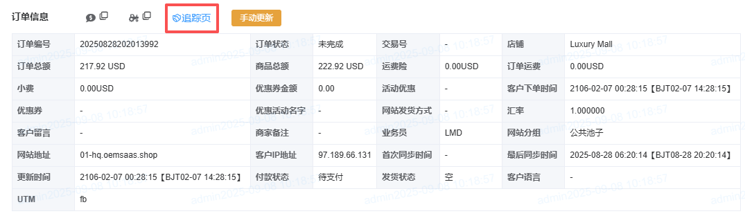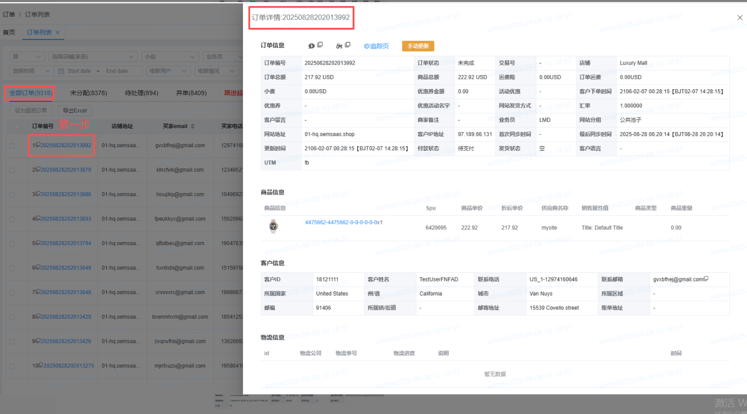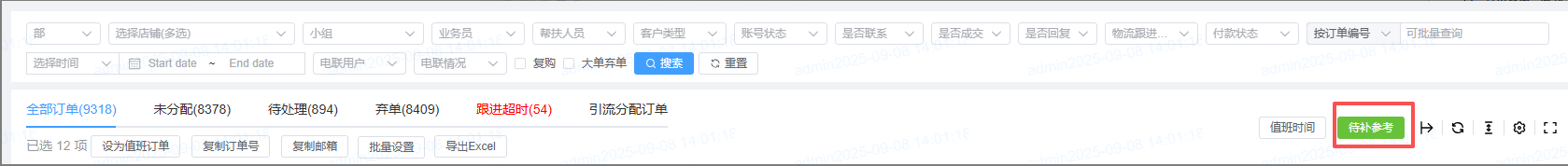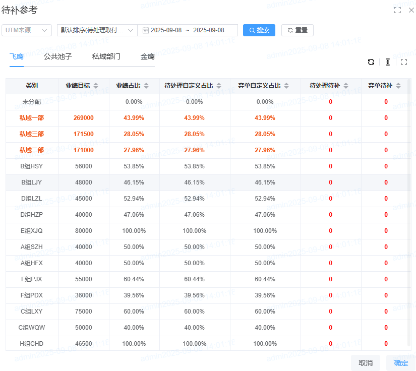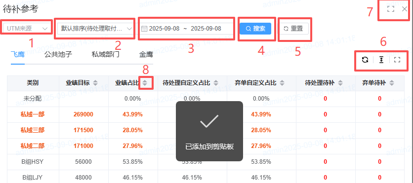### 1.1 全部订单 (1)点击订单编号,右边会弹出弹窗,可查看订单详情,分别有订单信息、商品信息、客户信息等。 (2)点击追踪页,会弹出订单追踪页详情,内容分为:平台订单追踪、物流/运输订单追踪等。      (3)点击待补参考,弹窗会展示对应分组的业绩占比情况;分组分为:飞鹰、公共池子、私域部门、金鹰,各个按钮可正常切换,点击搜索按进行搜索。   (4)待补参考各个类型下拉框选择 1.方式来源分为:facebook、instagram、tiktok、youtube可正常切换。 2. 排序分为:默认排序,按北京订单创建、更新、分配时间排序,按当地订单创建、更新、分配时间排序,切换之后点击搜索,进行搜索相关内容。 3. 时间筛选 4. 搜索按钮 5. 重置按钮 6. 刷新、全屏、密度(宽松、默认、紧凑)按钮 7. 全屏、关闭按钮 8. 占比排序按钮(由小到大、由大到小)进行排序