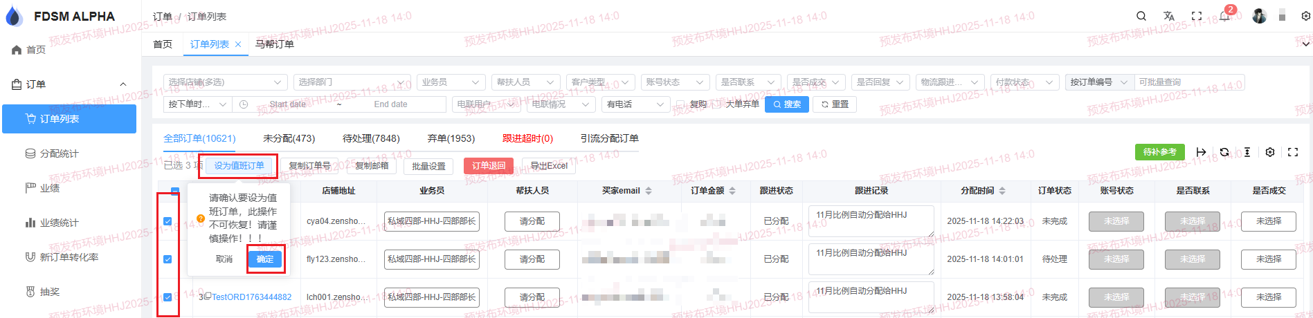 •选择订单数据,点击【设为值班订单】按钮,点击【确定】按钮。