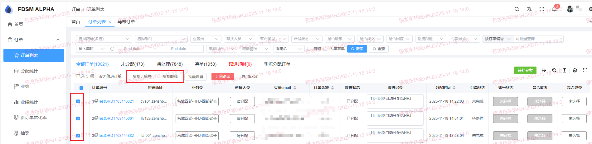 •选择订单数据,点击【复制订单号】或【复制邮箱】,可复制选中订单的订单号和邮箱。